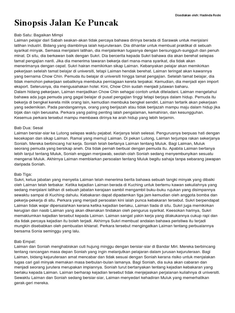 Dia dihantar ke syarikat Shell di Sarawak untuk menjalani latihan. Sinopsis Jalan Ke Puncak. Contohnya Mata pengurus itu menikam lembut wajah Laiman dengan hati yang lega.