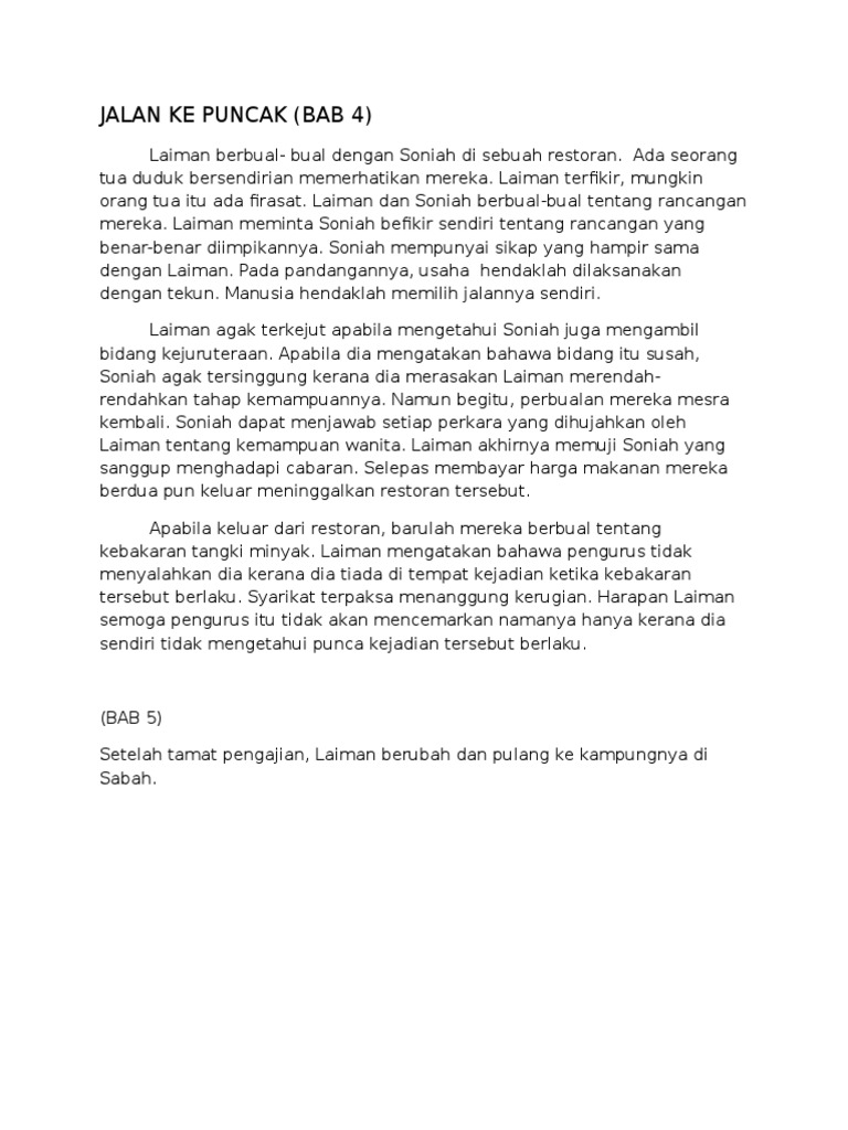 Sinopsis Mengikut Bab Bagi Novel Jalan Ke Puncak - Novel Tingkatan 2 Nukilan Juri Durabi Novel ini digunapakai di ZON 1. Download as DOCX PDF TXT or read online from Scribd. Laiman pemuda dari Sabah menuntut ilmu untuk mendapatkan ijazah Sarjana Muda dalam bidang Kejuruteraan.